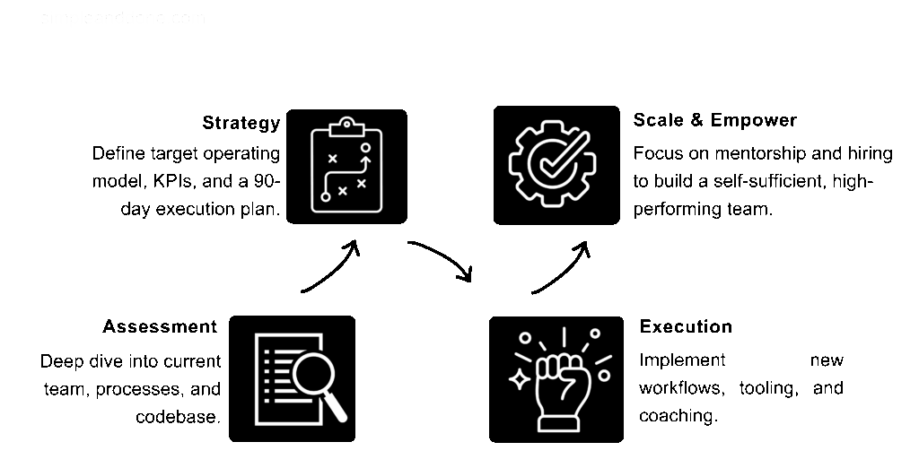 If engineering velocity is stalling due to unclear processes, technical debt, inefficient workflows, or a lack of strategic leadership. Teams are busy but not productive, and scaling the team feels chaotic. Your company might require.
